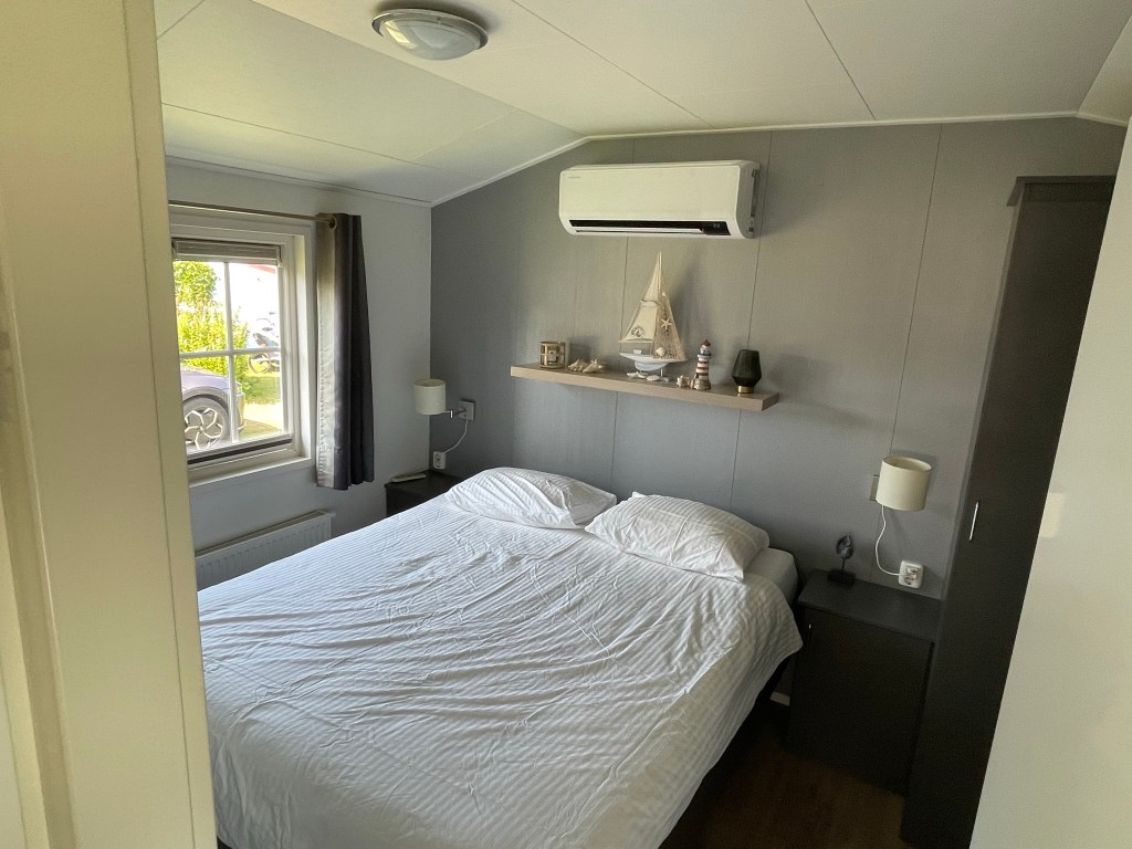 De slaapkamer met een tweepersoonsbed en een airco unit.
